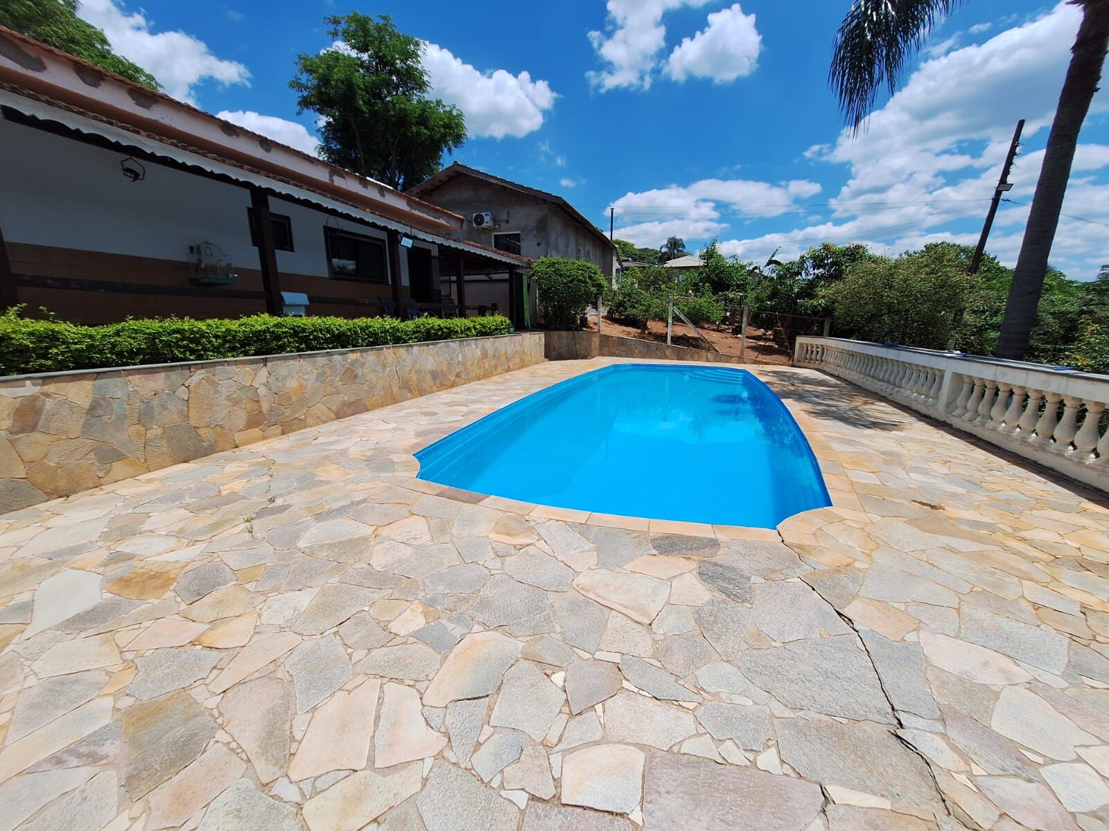 O paisagismo da propriedade é um espetáculo à parte, com inúmeros pinheiros, 10 palmeiras imperiais, primaveras, azaleias e um extenso gramado. O pomar diversificado oferece pés de lichia, jabuticabeiras, mangueiras e pitaias. A propriedade ainda conta com dois canis, um platô espaçoso para diversas vagas de veículos, um poço caipira e um poço semiartesiano, garantindo autonomia hídrica.